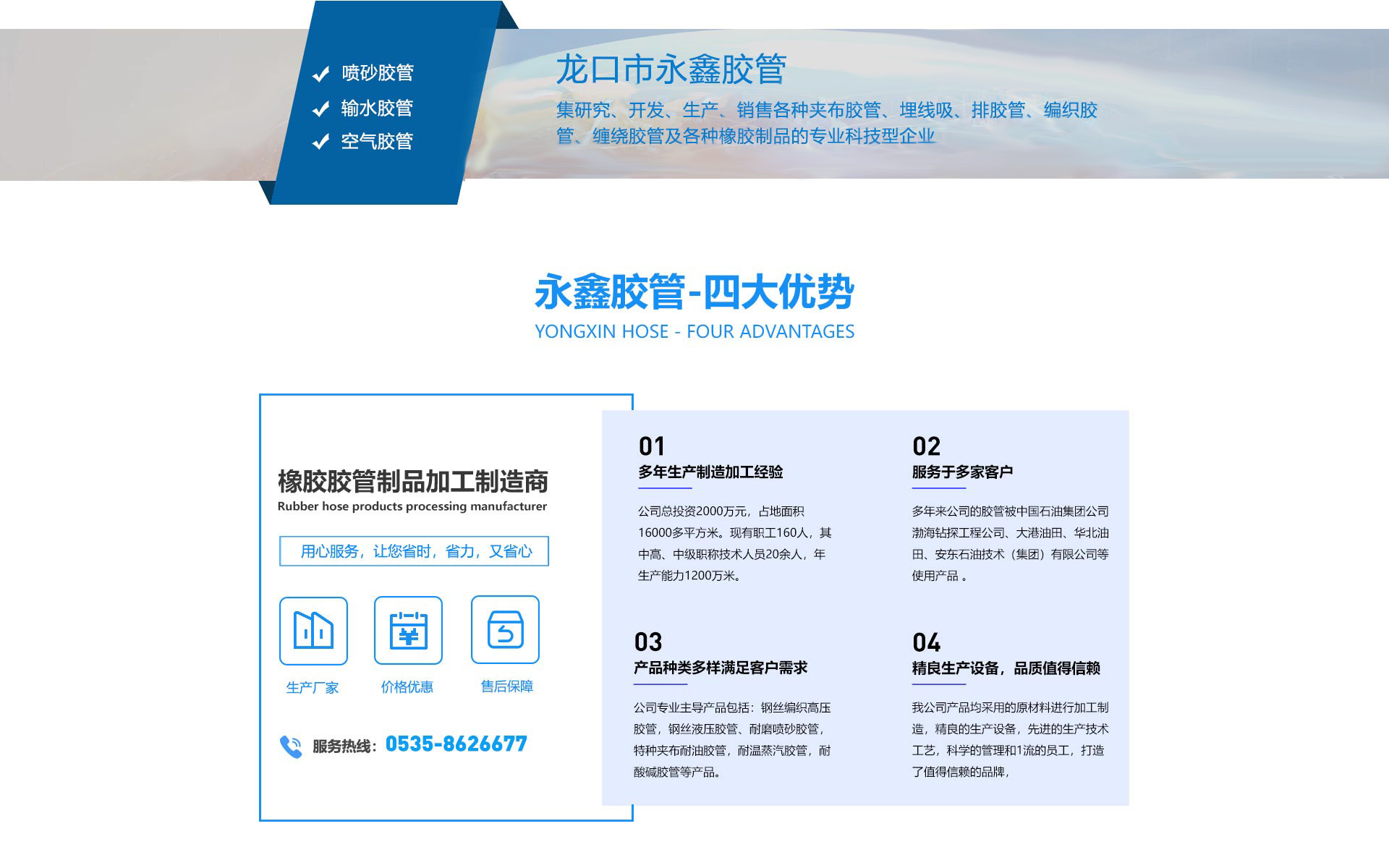 龍口市永鑫膠管有限公司始建于1979年。位于山東半島北端——龍口市,毗鄰龍口港、威烏高速公路和大萊龍鐵路,商業(yè)運輸,交通方便,地理位置好。公司總投資2000萬元,占地面積16000多平方米。現(xiàn)有職工160人,其中高、中級職稱技術(shù)人員20余人,年生產(chǎn)能力1200萬米。多年來公司的膠管被中國石油集團公司渤海鉆探工程公司、大港油田、華北油田、安東石油技術(shù)(集團)有限公司等使用產(chǎn)品我公司迎著十八界三中全會的改革大潮始終闊步向前,目前我公司主要從事高低壓橡膠軟管、鉆探膠管、夾布膠管、噴砂膠管、橡膠管帶制品,等產(chǎn)品的生產(chǎn)和研發(fā),主導(dǎo)產(chǎn)品包括:生產(chǎn),研制高低壓橡膠軟管、輸送皮帶等以橡塑為主的產(chǎn)品,擁有各類進口,國產(chǎn)生產(chǎn)設(shè)備120多臺套,化驗,分析,試驗儀器設(shè)備種類多,檢測手段完善。我公司產(chǎn)品均采用的原材料進行加工制造,精良的生產(chǎn)設(shè)備和穩(wěn)定技術(shù)工藝,科學的管理,打造了客戶信任的牌子,先后與多家石油、化工、汽車制造等大型國有企...